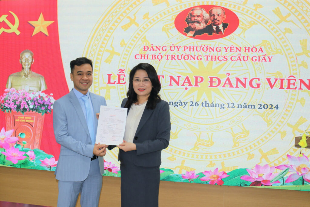 🕰 🏫 Sáng ngày 26/12/2024, trong không khí trang trọng và đầm ấm, Chi bộ trường THCS Cầu Giấy đã tổ chức lễ kết nạp đảng cho đồng chí Thiều Quang Tùng. Buổi lễ có sự hiện diện của đồng chí Nguyễn Thị Hoàng Hà – Phó Bí thư Thường trực Đảng ủy và đồng chí Lê Thị Thu Hoài – Thường trực Đảng ủy phường Yên Hoà cùng Ban Chi ủy và các Đảng viên thuộc Chi bộ trường THCS Cầu Giấy.
